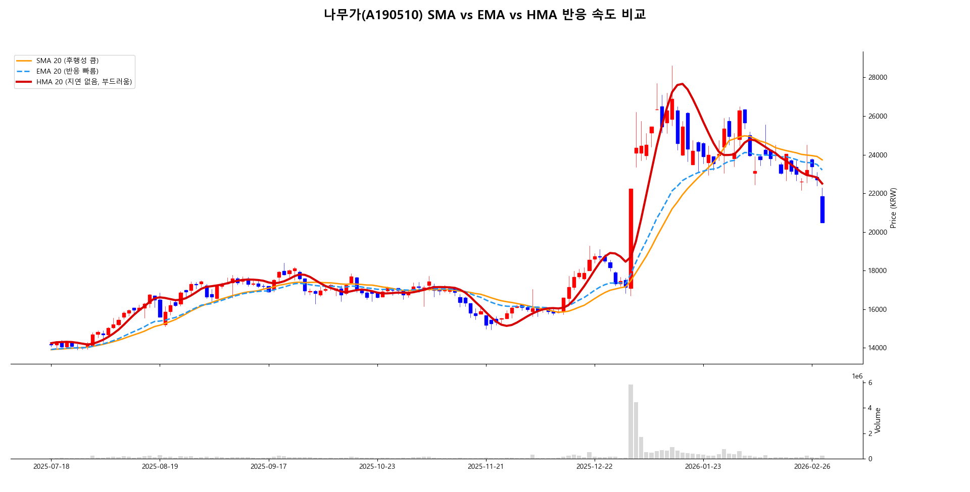 - 지연 없는 찰진 밀착력: 2025년 12월 하순, 주가가 가파른 랠리를 시작할 때 붉은색 굵은 선인 HMA 20을 보십시오. 과거 데이터에 발목이 잡힌 주황색 SMA 20이나 한 박자 늦게 따라오는 파란색 EMA 20과 달리, HMA는 캔들의 상승 궤적에 마치 그림자처럼 찰싹 달라붙어 지연(Lag) 없이 가파르게 솟구칩니다.