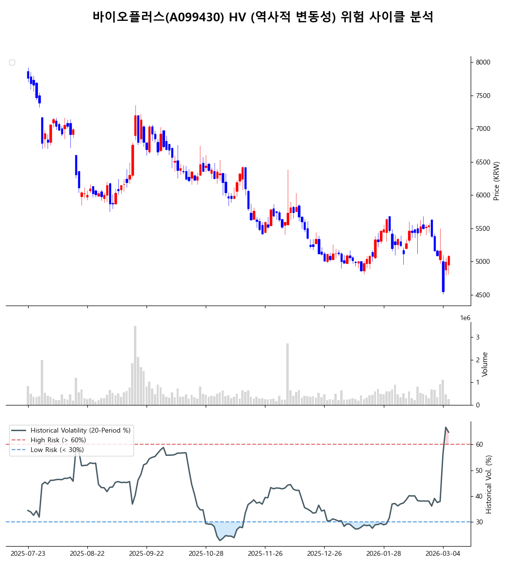 - 변동성 폭발과 리스크 극대화: 2026년 3월 초, 그 고요함이 깨집니다. 주가가 강하게 밑으로 쏟아지기 시작하자, 바닥을 기던 HV 지표가 순식간에 붉은색 기준선(60%) 위로 수직 상승하며 폭발합니다. 억눌렸던 에너지가 한꺼번에 터져 나오며 계좌의 리스크가 극대화되는 찰나를 시각적으로 완벽하게 포착해 내고 있습니다.