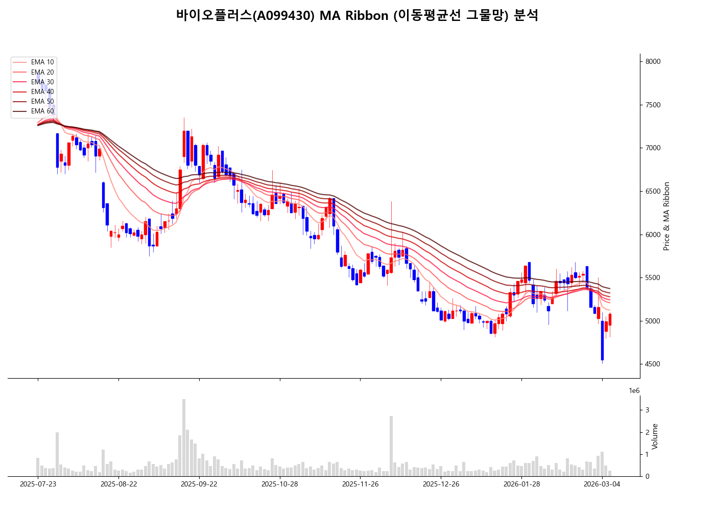 - 거대한 저항대(Resistance Zone) 역할: 이때 캔들의 움직임이 압권입니다. 주가가 단기적인 낙폭 과대로 인해 위로 반등을 시도하더라도, 이 넓게 펼쳐진 MA 리본의 그물망(저항대)에 부딪혀 번번이 다시 아래로 고개를 숙이고 처박힙니다. 그물망의 면적이 넓게 유지되는 한 하락 추세의 힘이 압도적이라는 것을 직관적으로 증명하고 있습니다.