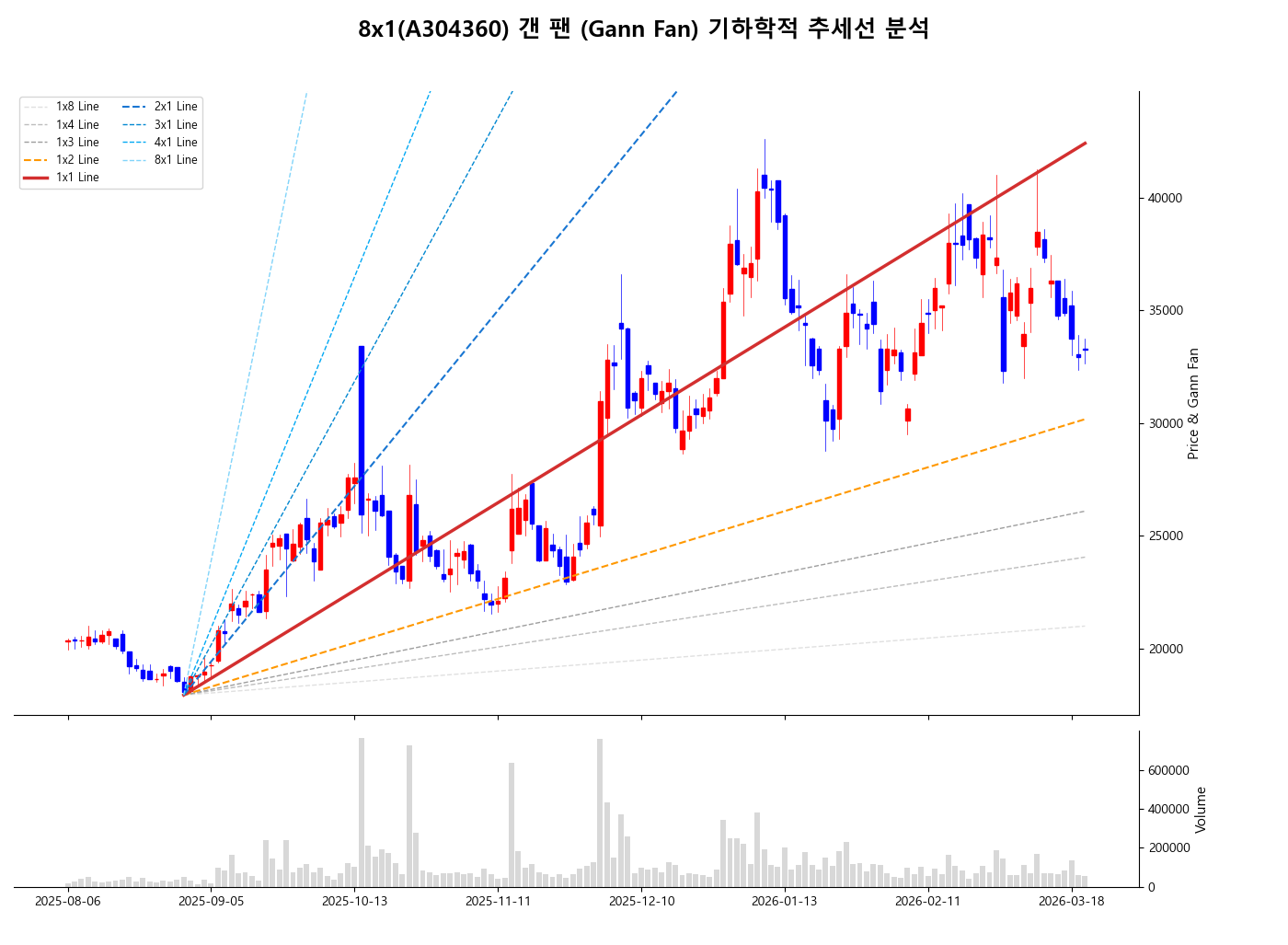 시간과 가격이 만나는 기하학적 균형점을 **8x1**의 차트를 통해 정밀하게 투시해 보겠습니다.