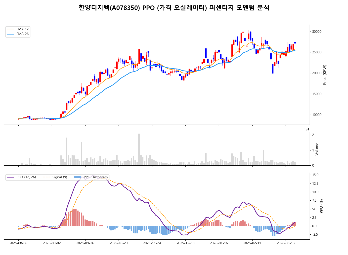 - 날카로운 하락 다이버전스 경고: 진짜 압권은 그 이후입니다. 2026년 1월의 두 번째 상승 파동에서 주가는 전고점 근처까지 강력하게 오르지만, 하단의 PPO는 고작 +5%에 머무는 명확한 '하락 다이버전스(주가 고점 상승/지표 고점 하락)'를 발생시킵니다. 상승 엔진의 힘이 완전히 빠졌음을 시각적으로 소름 돋게 사전에 경고하고 있습니다.