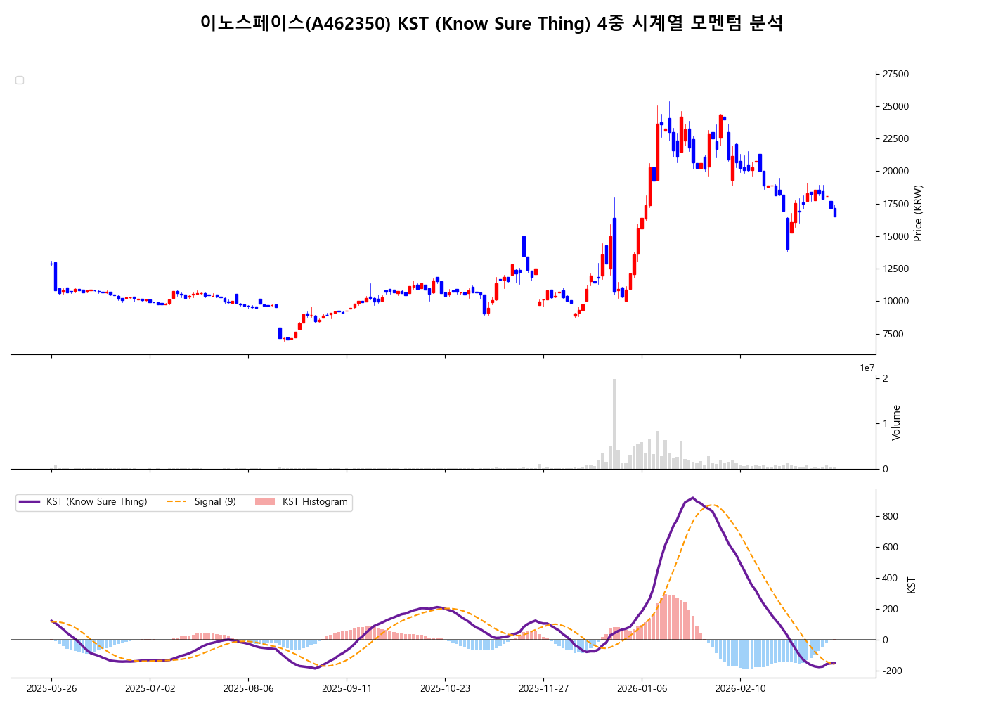 - 노이즈의 완벽한 제거: 2025년 하반기 내내 주가가 지루하게 박스권을 횡보하며 잔파도를 칠 때, 일반적인 MACD나 RSI였다면 수많은 휩쏘를 만들었을 것입니다. 하지만 4번이나 다림질을 거친 KST는 그 모든 노이즈를 무시한 채 거대하고 부드러운 하나의 곡선만을 묵직하게 그려냅니다.
