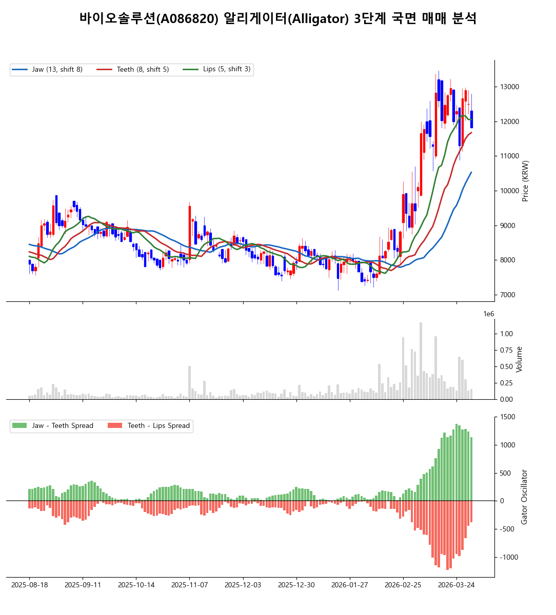 - 사냥기 (추세 폭발): 2026년 2월, 주가가 거래량을 동반하며 튀어 오르자 잠자던 악어가 눈을 번쩍 뜹니다. 초록색 입술 선이 위로 치솟으며 파란색 턱 선과 간격을 벌리기 시작하고, 세 선이 완벽한 정배열을 이루며 부채꼴로 입을 쩍 벌립니다. 하단의 오실레이터가 거대한 막대를 뿜어내며 폭발적인 상승 추세에 올라탔음을 시각적으로 완벽하게 증명합니다.