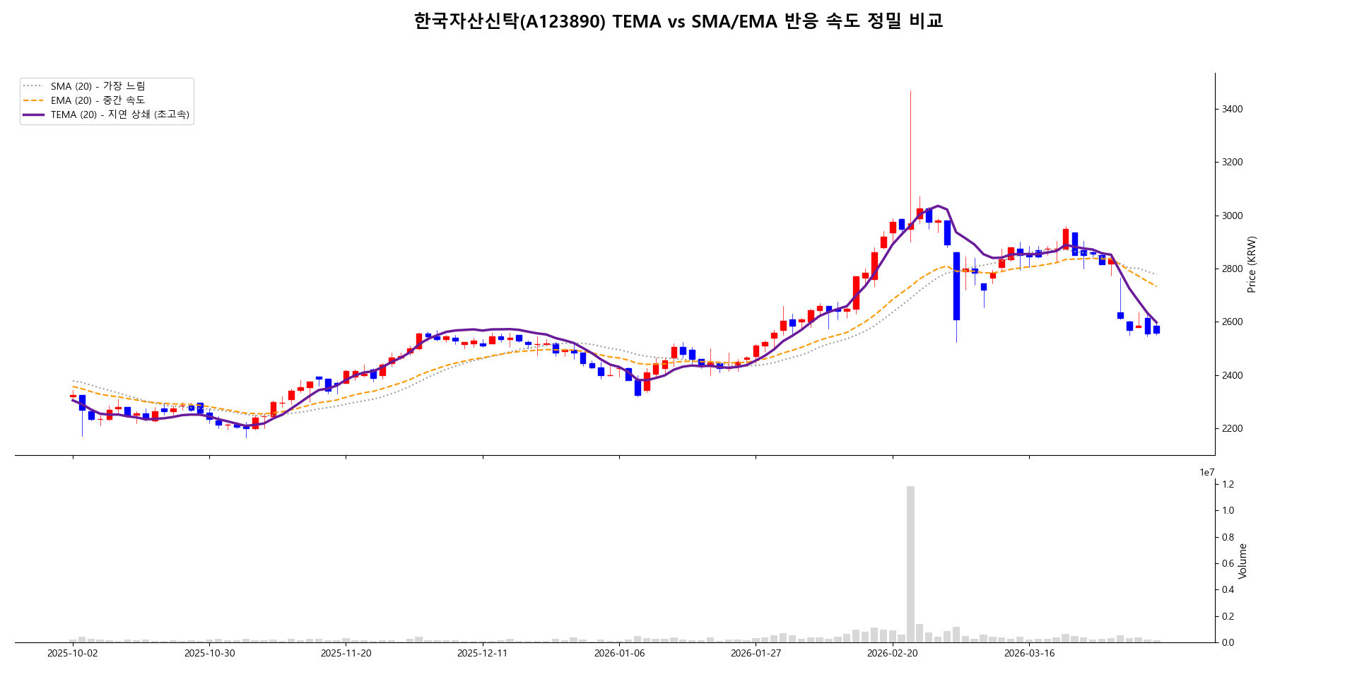 - 거머리 같은 추세 추종: 차트 전반의 상승장을 보십시오. 세 가지 이평선 모두 동일한 20일 주기를 사용했지만, 회색 점선(SMA)과 주황 파선(EMA)이 주가와 멀리 떨어져 후행하는 반면, 보라색 실선의 TEMA는 주가의 바로 밑에 찰싹 달라붙어 완벽한 지지선 역할을 수행합니다.