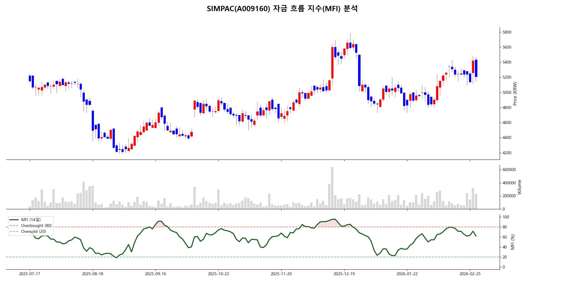 - 과매도(Oversold) 구간의 탈출: 2026년 1월 하순, 주가가 급격한 조정을 받으며 전저점 부근까지 하락할 때 하단 패널의 진한 녹색 MFI 선이 파란색 20선(과매도)을 터치합니다. 대중의 투매 속에서 자금 이탈이 정점에 달했음을 수리적으로 증명하며, 이후 MFI가 20선을 회복할 때 강력한 기술적 반등이 시작되었습니다.