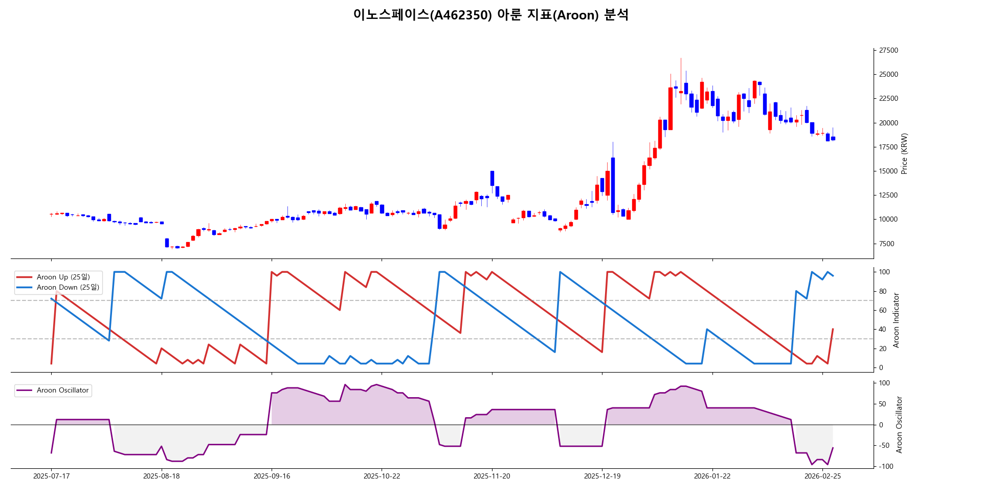 - 추세의 반전과 소멸: 2026년 2월 중순 이후 주가가 하락세로 돌아서자, 아룬 업 수치가 급락하고 반대로 아룬 다운 수치가 100을 향해 치솟습니다. 오실레이터 역시 0선 아래(음수)로 떨어지며, 매도 압력이 시장을 장악했음을 수리적으로 확인시켜 줍니다.