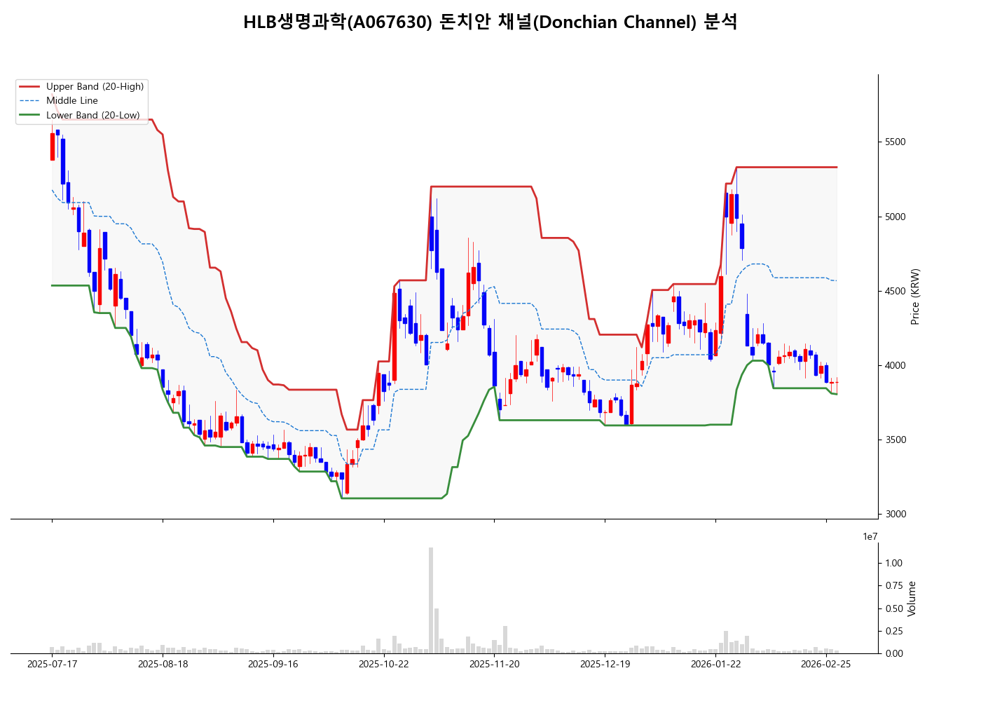 - 신고가 돌파(Breakout) 매수 타점: 2025년 10월 하순, 지루한 횡보장 속에서 평평하게 유지되던 붉은색 상단 밴드를 주가가 막대한 거래량과 함께 강하게 뚫고 올라갑니다. 터틀 트레이딩에서 말하는 전형적인 '20일 고가 돌파 진입' 신호입니다. 이후 주가가 상단 밴드를 위로 계속 밀어 올리며 계단을 형성하는 동안, 추세에 편승하여 수익을 극대화하게 됩니다.